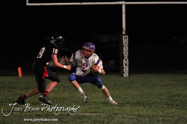 Otis-Bison Cougar Dylan Wissman (#2) moves to avoid the tackle of Sylvan-Lucas Unified Mustang Collin Herold (#18) during the Otis-Bison visiting Sylvan-Lucas Unified Eight Man Division II District 7 matchup with Otis-Bison winning 76-26 in Sylvan Grove, Kansas on October 25, 2012. (Photo: Joey Bahr, www.joeybahr.com)