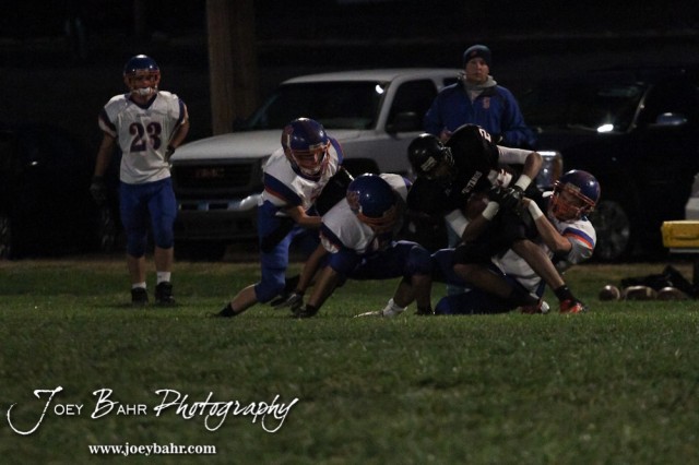 Otis-Bison Cougar Dylan Wissman (#2) tackles Sylvan-Lucas Unified Mustang Kelvin Lopez (#24) during the Otis-Bison visiting Sylvan-Lucas Unified Eight Man Division II District 7 matchup with Otis-Bison winning 76-26 in Sylvan Grove, Kansas on October 25, 2012. (Photo: Joey Bahr, www.joeybahr.com)