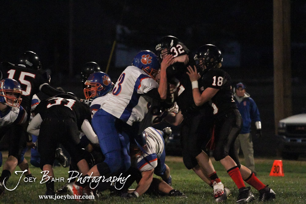 Otis-Bison Cougar Jordan Hoffman (#33) stands up Sylvan-Lucas Unified Mustang Brogan Naylor (#32) during the Otis-Bison visiting Sylvan-Lucas Unified Eight Man Division II District 7 matchup with Otis-Bison winning 76-26 in Sylvan Grove, Kansas on October 25, 2012. (Photo: Joey Bahr, www.joeybahr.com)