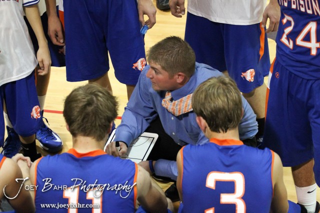 Otis-Bison Cougar Head Coach Bryant Briggs addresses his players before the start of the Second Half during the Otis-Bison Boys at Wilson basketball game with Otis-Bison winning 46 to 41 taken at Wilson High School in Wilson, Kansas on November 30, 2012. (Photo: Joey Bahr, www.joeybahr.com)