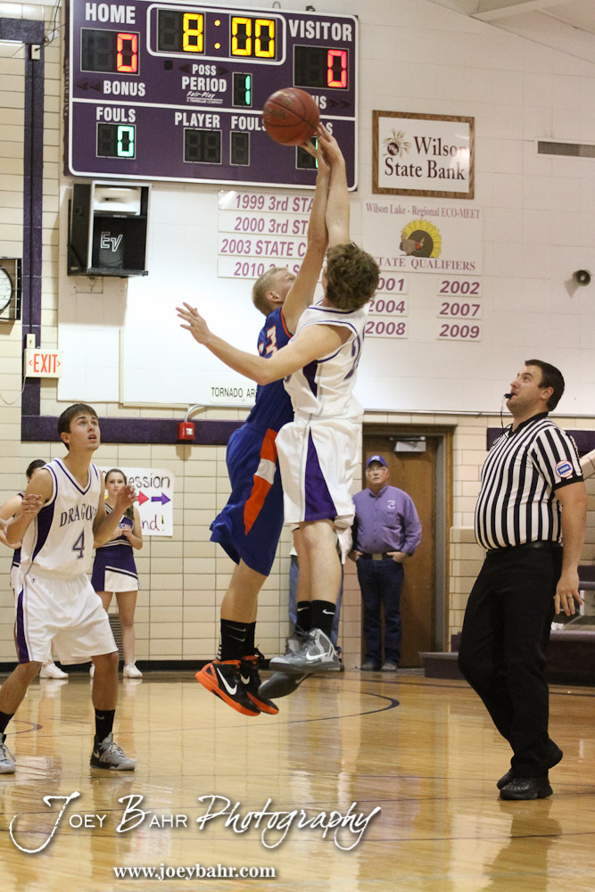 Otis-Bison Cougar Jordan Hoffman (#23) and Wilson Dragon Marcus Denham (#23) jump up for the ball during the Otis-Bison Boys at Wilson basketball game with Otis-Bison winning 46 to 41 taken at Wilson High School in Wilson, Kansas on November 30, 2012. (Photo: Joey Bahr, www.joeybahr.com)