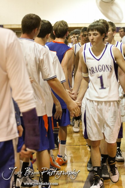 Members of the Wilson Dragons and Otis-Bison Cougars shake hands after the Otis-Bison Boys at Wilson basketball game with Otis-Bison winning 46 to 41 taken at Wilson High School in Wilson, Kansas on November 30, 2012. (Photo: Joey Bahr, www.joeybahr.com)