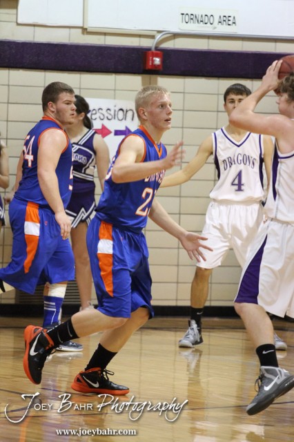 Otis-Bison Cougar Jordan Hoffman (#23) watches the ball on defense during the Otis-Bison Boys at Wilson basketball game with Otis-Bison winning 46 to 41 taken at Wilson High School in Wilson, Kansas on November 30, 2012. (Photo: Joey Bahr, www.joeybahr.com)
