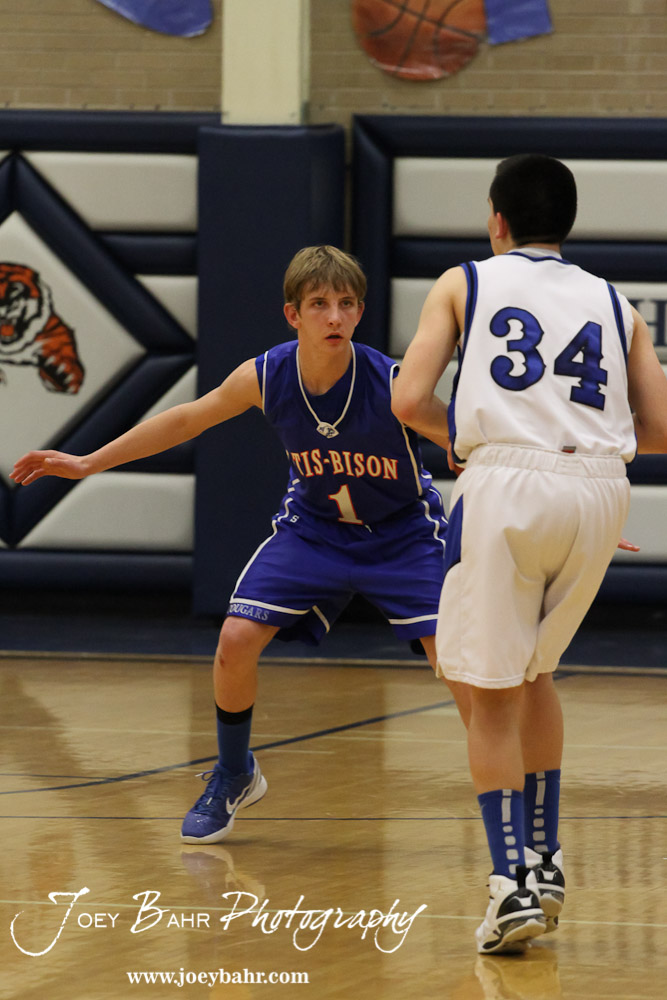 Justus Bartonek (#1) of the Otis-Bison Cougars watches St. John Tiger Zuriel Reyes (#34) at St. John High School in St. John, Kansas on February 21, 2012. Photo: Joey Bahr