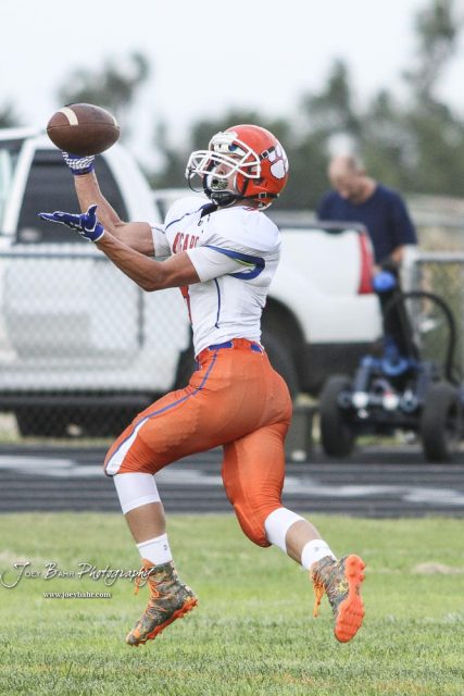 Otis-Bison Cougar #8 Daniel Scott catches a pass during pre-game warmups. The Otis-Bison Cougars defeated the St. John Tigers by a score of 58 to 0 at St. John High School in St. John, Kansas on September 1, 2017. (Photo: Joey Bahr, www.joeybahr.com)undefined