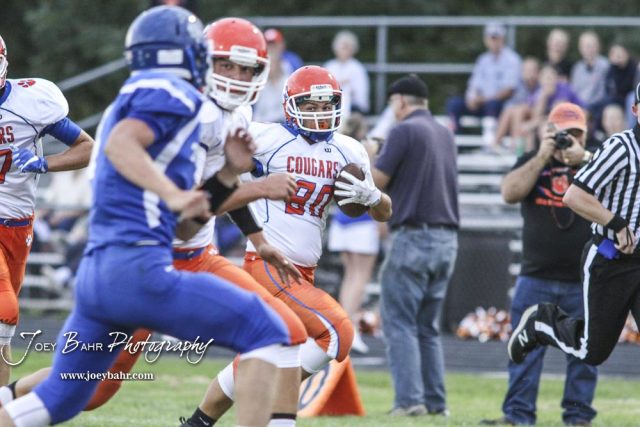 Otis-Bison Cougar #80 Seth Hoopingarner looks down the field at a possible St. John Tiger tackler in the first quarter. The Otis-Bison Cougars defeated the St. John Tigers by a score of 58 to 0 at St. John High School in St. John, Kansas on September 1, 2017. (Photo: Joey Bahr, www.joeybahr.com)undefined