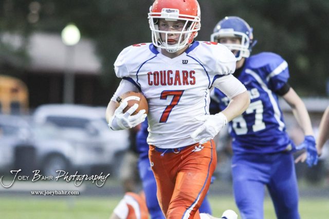 Otis-Bison Cougar #7 Blake Bahr rushes with the ball in the second quarter. The Otis-Bison Cougars defeated the St. John Tigers by a score of 58 to 0 at St. John High School in St. John, Kansas on September 1, 2017. (Photo: Joey Bahr, www.joeybahr.com)undefined
