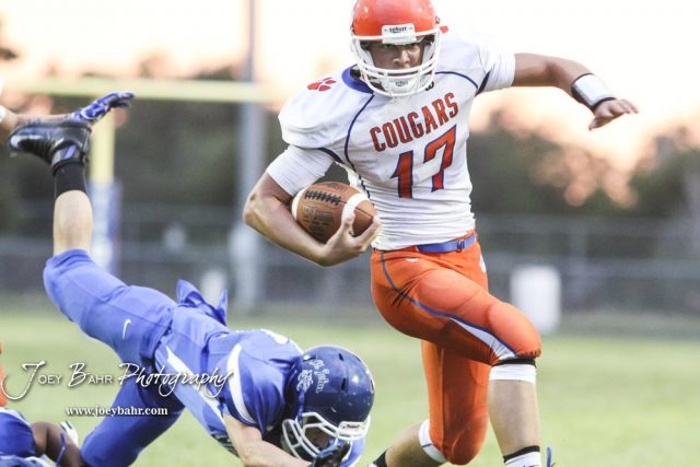 Otis-Bison Cougar #17 Anton Foust avoids a tackle in the second quarter. The Otis-Bison Cougars defeated the St. John Tigers by a score of 58 to 0 at St. John High School in St. John, Kansas on September 1, 2017. (Photo: Joey Bahr, www.joeybahr.com)undefined