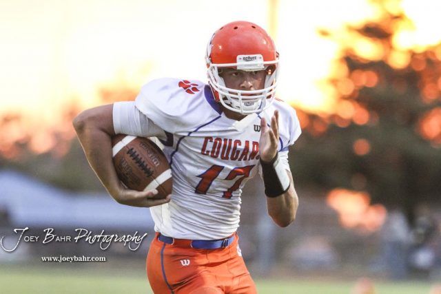 Otis-Bison Cougar #17 Anton Foust rushes with the ball in the second quarter. The Otis-Bison Cougars defeated the St. John Tigers by a score of 58 to 0 at St. John High School in St. John, Kansas on September 1, 2017. (Photo: Joey Bahr, www.joeybahr.com)undefined