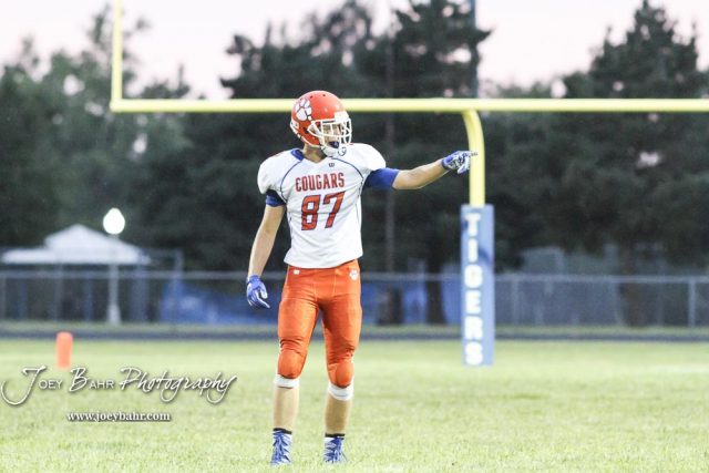 Otis-Bison Cougar #87 Maitland Wiltse checks to see if he is on or off the line in the second quarter. The Otis-Bison Cougars defeated the St. John Tigers by a score of 58 to 0 at St. John High School in St. John, Kansas on September 1, 2017. (Photo: Joey Bahr, www.joeybahr.com)undefined