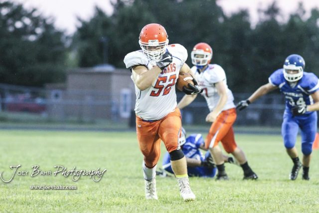 Otis-Bison Cougar #52 Luke Higgason rushes with the ball in the second quarter. The Otis-Bison Cougars defeated the St. John Tigers by a score of 58 to 0 at St. John High School in St. John, Kansas on September 1, 2017. (Photo: Joey Bahr, www.joeybahr.com)undefined