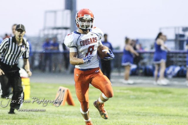 Otis-Bison Cougar #8 Daniel Scott runs towards the end zone in the second quarter. The Otis-Bison Cougars defeated the St. John Tigers by a score of 58 to 0 at St. John High School in St. John, Kansas on September 1, 2017. (Photo: Joey Bahr, www.joeybahr.com)undefined