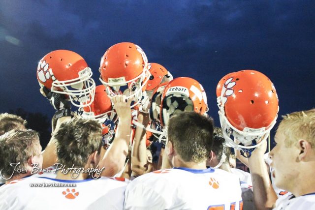 The Otis-Bison Cougars breakdown after the game. The Otis-Bison Cougars defeated the St. John Tigers by a score of 58 to 0 at St. John High School in St. John, Kansas on September 1, 2017. (Photo: Joey Bahr, www.joeybahr.com)undefined