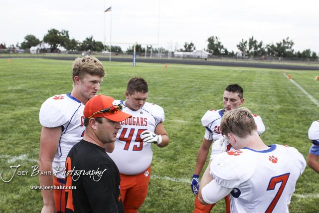Otis-Bison Cougar Head Coach Travis Starr talks to his Senior players #7 Blake Bahr, #8 Daniel Scott, #45 Landon Hoopingarner, and #37 Clade Anderson before the start of the game. The Otis-Bison Cougars defeated the St. John Tigers by a score of 58 to 0 at St. John High School in St. John, Kansas on September 1, 2017. (Photo: Joey Bahr, www.joeybahr.com)undefined