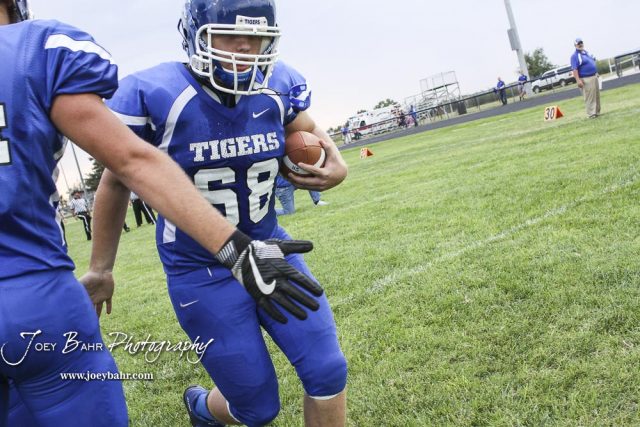 St. John Tiger #68 Trevor Tanner carries the game ball on to the field during player introductions. The Otis-Bison Cougars defeated the St. John Tigers by a score of 58 to 0 at St. John High School in St. John, Kansas on September 1, 2017. (Photo: Joey Bahr, www.joeybahr.com)undefined