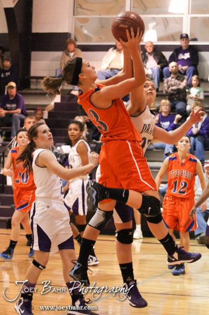 Otis-Bison Lady Cougar Hannah Bannister (#23) goes up for a shot while Wilson Lady Dragon Karlie Steinle (#12) defends during the Otis-Bison Girls at Wilson basketball game with Wilson winning 65 to 45 taken at Wilson High School in Wilson, Kansas on November 30, 2012. (Photo: Joey Bahr, www.joeybahr.com)
