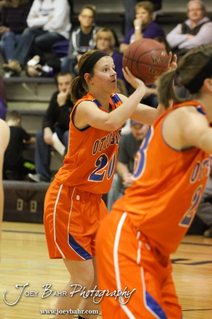 Otis-Bison Lady Cougar Emily Schneider (#20) shoots a free throw attempt during the Otis-Bison Girls at Wilson basketball game with Wilson winning 65 to 45 taken at Wilson High School in Wilson, Kansas on November 30, 2012. (Photo: Joey Bahr, www.joeybahr.com)