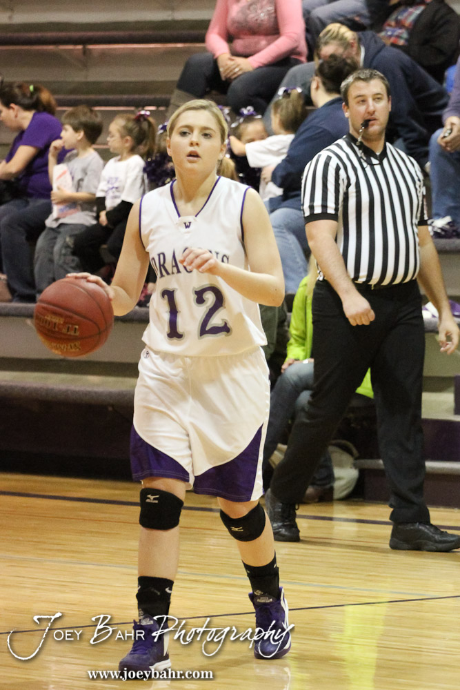 Wilson Lady Dragon Karlie Steinle (#12) carries the ball across the half court line during the Otis-Bison Girls at Wilson basketball game with Wilson winning 65 to 45 taken at Wilson High School in Wilson, Kansas on November 30, 2012. (Photo: Joey Bahr, www.joeybahr.com)