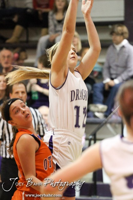 Wilson Lady Dragon Karlie Steinle (#12) goes up for a shot while Otis-Bison Lady Cougar Demi Bartonek (#13) defends during the Otis-Bison Girls at Wilson basketball game with Wilson winning 65 to 45 taken at Wilson High School in Wilson, Kansas on November 30, 2012. (Photo: Joey Bahr, www.joeybahr.com)