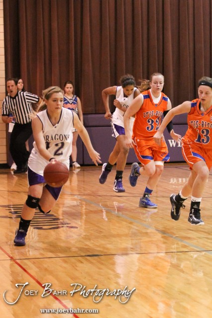 Wilson Lady Dragon Karlie Steinle (#12) drives the ball down the court during the Otis-Bison Girls at Wilson basketball game with Wilson winning 65 to 45 taken at Wilson High School in Wilson, Kansas on November 30, 2012. (Photo: Joey Bahr, www.joeybahr.com)