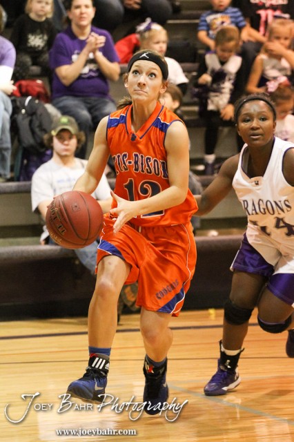 Otis-Bison Lady Cougar Annie Kraisinger (#12) goes up for a layup while Wilson Lady Dragon Tanisha Steinike (#14) defends during the Otis-Bison Girls at Wilson basketball game with Wilson winning 65 to 45 taken at Wilson High School in Wilson, Kansas on November 30, 2012. (Photo: Joey Bahr, www.joeybahr.com)