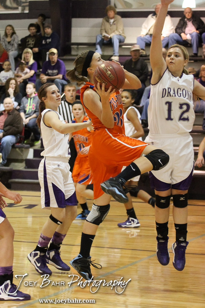 Otis-Bison Lady Cougar Hannah Bannister (#23) goes up for a shot while Wilson Lady Dragon Karlie Steinle (#12) defends during the Otis-Bison Girls at Wilson basketball game with Wilson winning 65 to 45 taken at Wilson High School in Wilson, Kansas on November 30, 2012. (Photo: Joey Bahr, www.joeybahr.com)