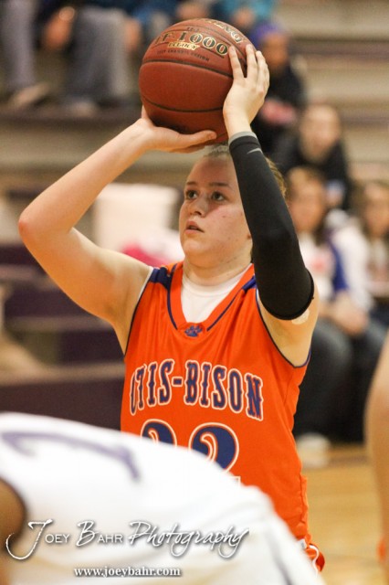 Otis-Bison Lady Cougar Kim Pechanec (#32) shoots a free throw attempt during the Otis-Bison Girls at Wilson basketball game with Wilson winning 65 to 45 taken at Wilson High School in Wilson, Kansas on November 30, 2012. (Photo: Joey Bahr, www.joeybahr.com)