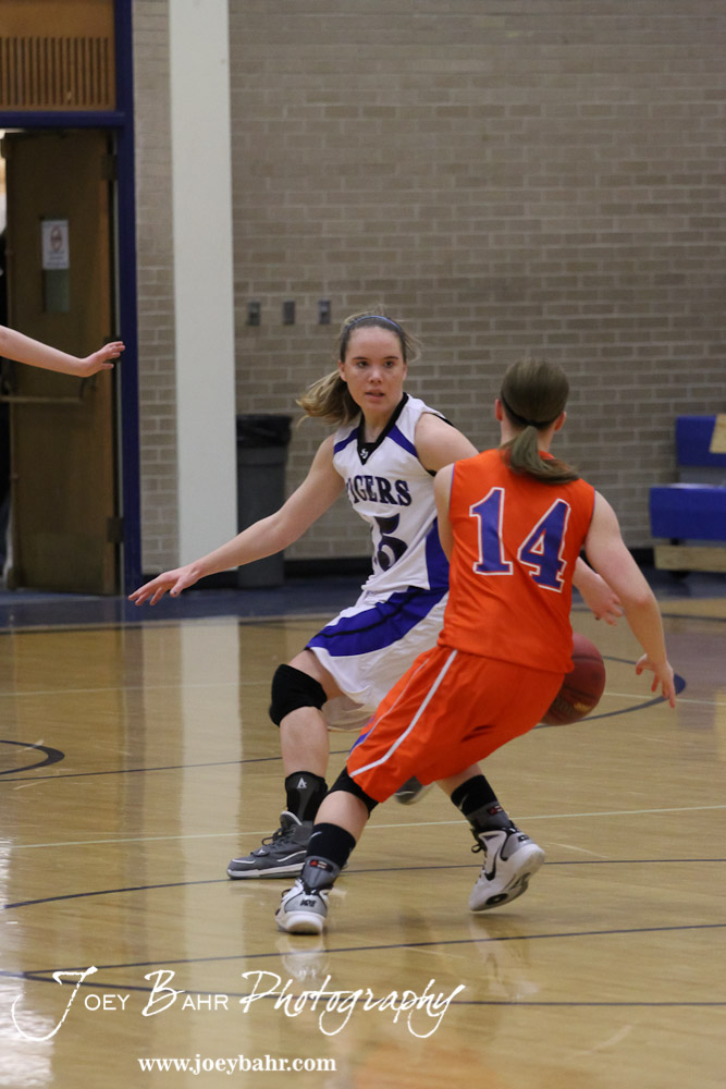 Otis-Bison Lady Cougar Dekota Nelson (#14) tries to drive around St. John Lady Tiger Tara Christie (#15) at St. John High School in St. John, Kansas on February 21, 2012. Photo: Joey Bahr