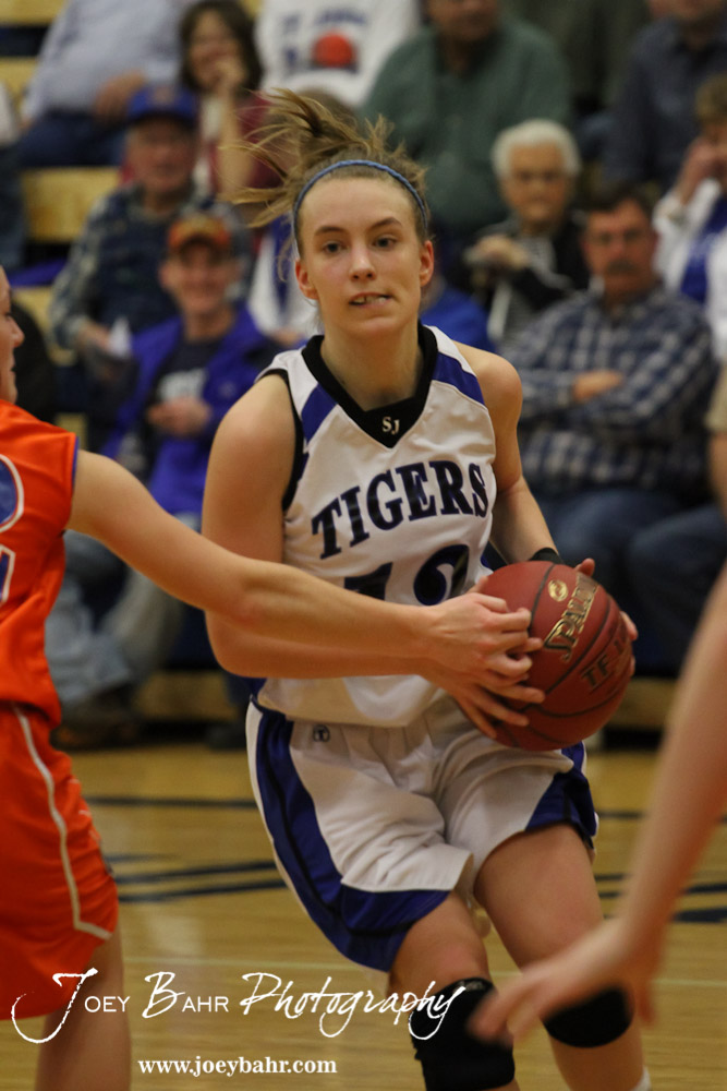 St. John Lady Tiger Jamie Waters (#12) drives into the the Otis-Bison Lady Cougar defense at St. John High School in St. John, Kansas on February 21, 2012. Photo: Joey Bahr