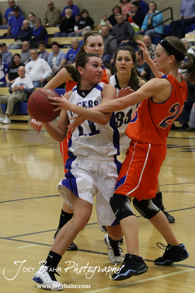Morgan Osborne (#11) of the St. John Lady Tigers tries to pass the ball around the defense of Hannah Bannister (#23) of the Otis-Bison Lady Cougars at St. John High School in St. John, Kansas on February 21, 2012. Photo: Joey Bahr