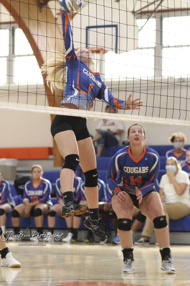Otis-Bison Lady Cougar #17 Lauren Maier jumps for a kill. Otis-Bison Volleyball Triangular hosted at Otis-Bison High School in Otis, Kansas on September 1, 2020. (Photo: Joey Bahr, www.joeybahr.com)