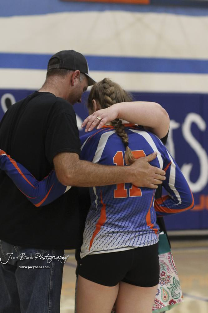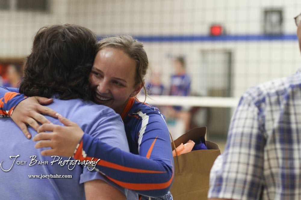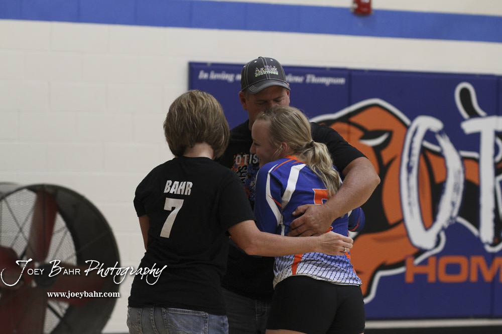 Otis-Bison Lady Cougar #7 Abbi Bahr greets her parents, Jennifer and Kevin Bahr, during Senior Night. Otis-Bison Volleyball Triangular hosted at Otis-Bison High School in Otis, Kansas on September 1, 2020. (Photo: Joey Bahr, www.joeybahr.com)