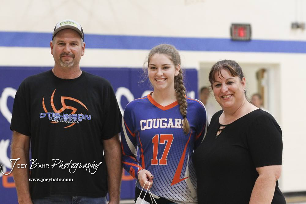 Otis-Bison Lady Cougar #17 Lauren Maier poses with her parents, Brian and Janelle. }Otis-Bison Volleyball Triangular hosted at Otis-Bison High School in Otis, Kansas on September 1, 2020. (Photo: Joey Bahr, www.joeybahr.com)