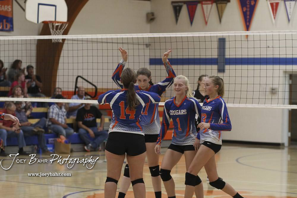 The Otis-Bison Lady Cougars celebrate a won point. Otis-Bison Volleyball Triangular hosted at Otis-Bison High School in Otis, Kansas on September 1, 2020. (Photo: Joey Bahr, www.joeybahr.com)