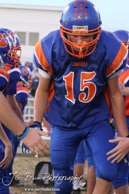 Otis-Bison Cougar Justus Bartonek (#15) is introduced before the Wilson High School at Otis-Bison High School Eight Man Division II District 7 matchup with Otis-Bison winning 60-14 in Otis, Kansas on October 19, 2012. (Photo: Joey Bahr, www.joeybahr.com)