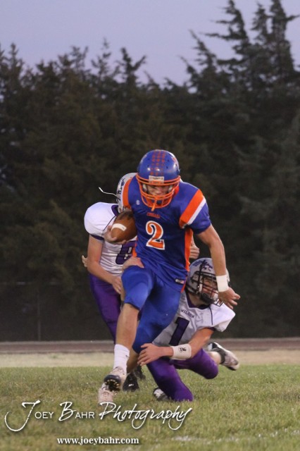 Otis-Bison Cougar Dylan Wissman (#2) runs through the tackle of Wilson Dragon Cole Zelenka (#1) during the Wilson High School at Otis-Bison High School Eight Man Division II District 7 matchup with Otis-Bison winning 60-14 in Otis, Kansas on October 19, 2012. (Photo: Joey Bahr, www.joeybahr.com)