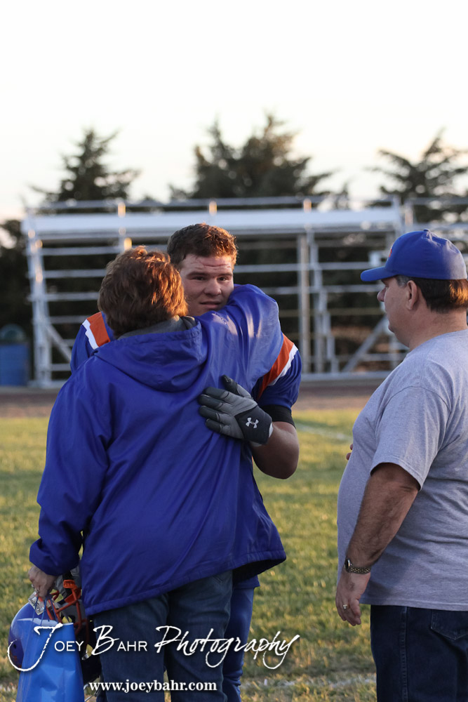 Otis-Bison Cougar Samuel Higgason (#45) greets his family before the Wilson High School at Otis-Bison High School Eight Man Division II District 7 matchup with Otis-Bison winning 60-14 in Otis, Kansas on October 19, 2012. (Photo: Joey Bahr, www.joeybahr.com)
