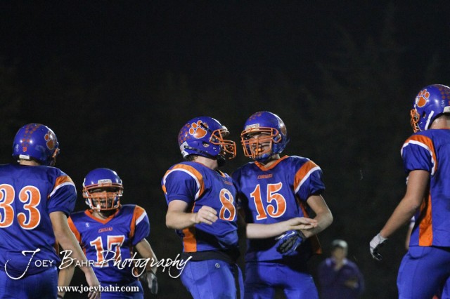 Otis-Bison Cougar Justus Bartonek (#15) congratulates Matthew Demel (#88) on his interception during the Wilson High School at Otis-Bison High School Eight Man Division II District 7 matchup with Otis-Bison winning 60-14 in Otis, Kansas on October 19, 2012. (Photo: Joey Bahr, www.joeybahr.com)