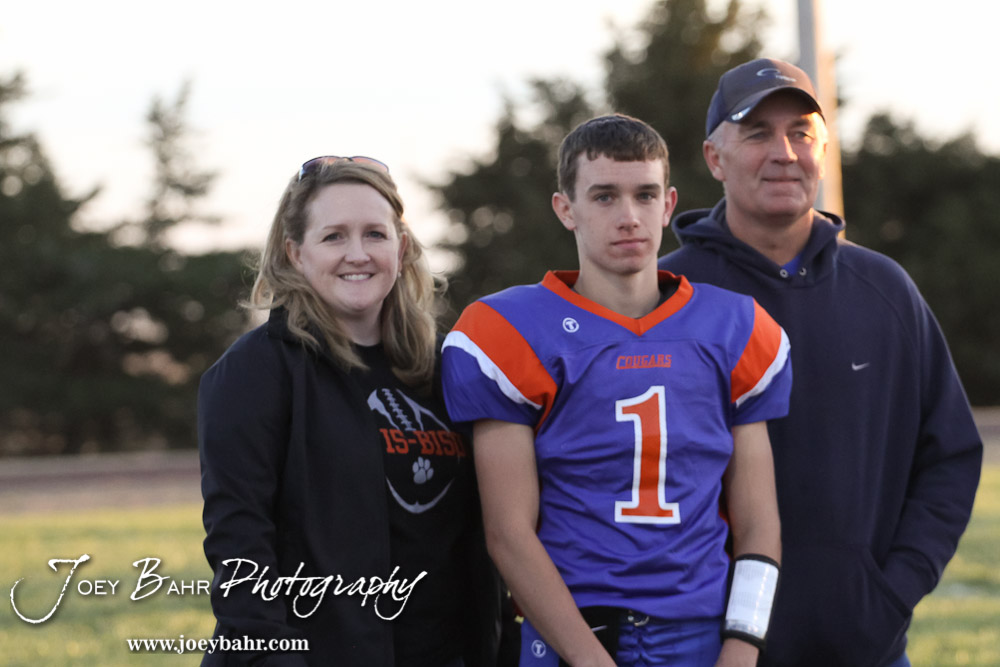 Otis-Bison Cougar Kole Urban (#1) stands with his parents before the Wilson High School at Otis-Bison High School Eight Man Division II District 7 matchup with Otis-Bison winning 60-14 in Otis, Kansas on October 19, 2012. (Photo: Joey Bahr, www.joeybahr.com)