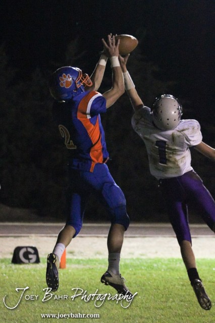 Wilson Dragon Cole Zelenka (#1) breaks up a pass attempt to Otis-Bison Cougar Dylan Wissman (#2) during the Wilson High School at Otis-Bison High School Eight Man Division II District 7 matchup with Otis-Bison winning 60-14 in Otis, Kansas on October 19, 2012. (Photo: Joey Bahr, www.joeybahr.com)