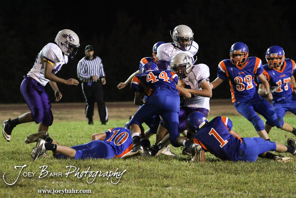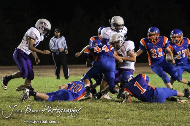 Otis-Bison Cougar Hayden Maier (#44) makes a tackle during the Wilson High School at Otis-Bison High School Eight Man Division II District 7 matchup with Otis-Bison winning 60-14 in Otis, Kansas on October 19, 2012. (Photo: Joey Bahr, www.joeybahr.com)