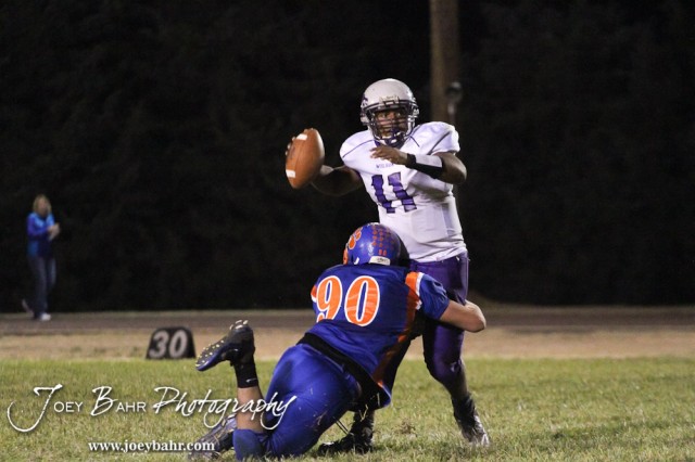 Otis-Bison Cougar Tyler Maier (#90) tries to bring down Wilson Dragon Quarterback Jordan Bess (#11) during the Wilson High School at Otis-Bison High School Eight Man Division II District 7 matchup with Otis-Bison winning 60-14 in Otis, Kansas on October 19, 2012. (Photo: Joey Bahr, www.joeybahr.com)