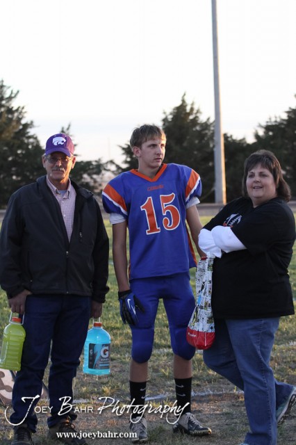 Otis-Bison Cougar Justus Bartonek (#15) stands with his parents before the Wilson High School at Otis-Bison High School Eight Man Division II District 7 matchup with Otis-Bison winning 60-14 in Otis, Kansas on October 19, 2012. (Photo: Joey Bahr, www.joeybahr.com)