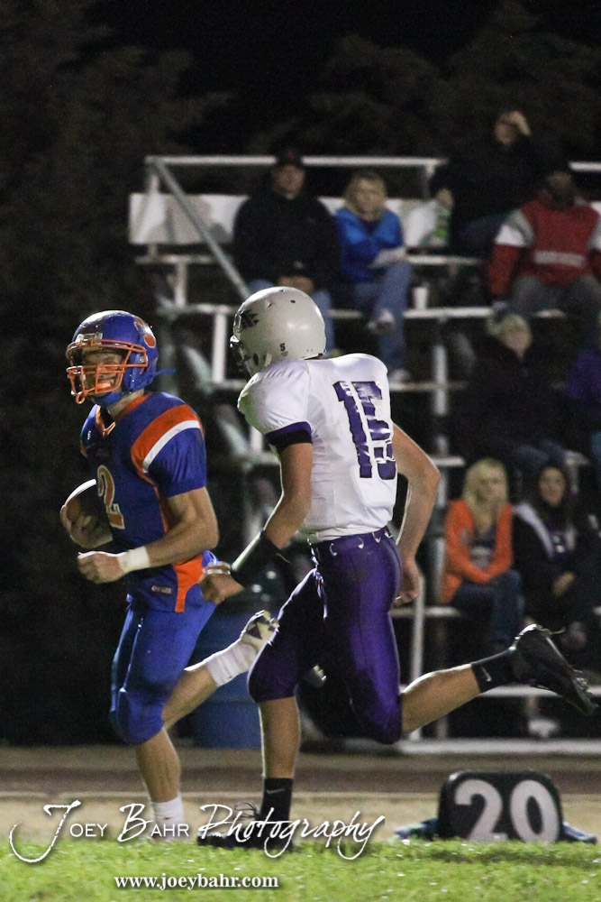 Otis-Bison Cougar Dylan Wissman (#2) carries the ball during the Wilson High School at Otis-Bison High School Eight Man Division II District 7 matchup with Otis-Bison winning 60-14 in Otis, Kansas on October 19, 2012. (Photo: Joey Bahr, www.joeybahr.com)