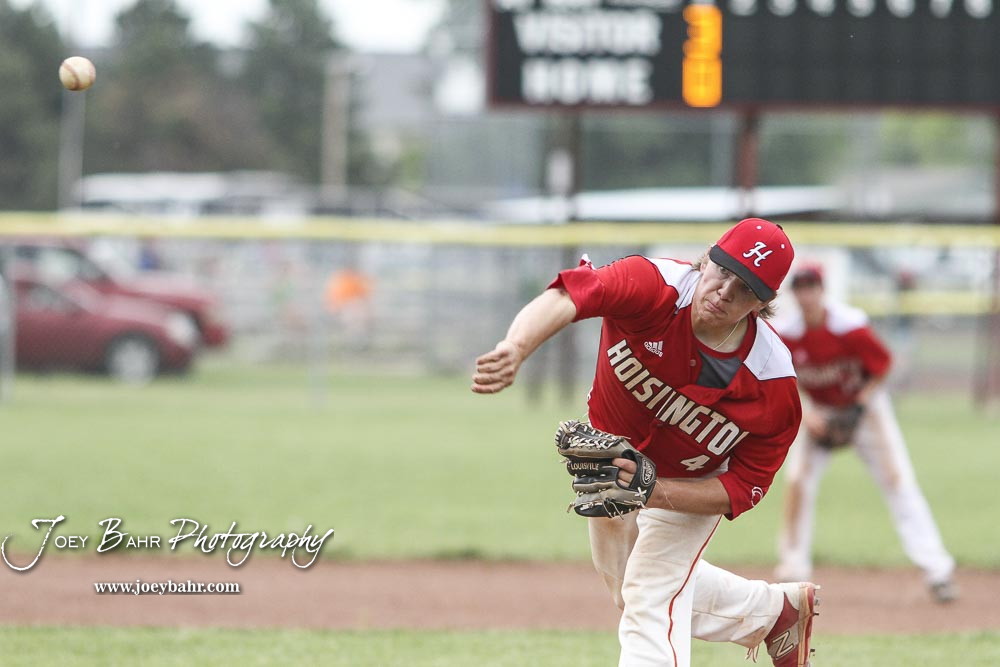 Hoisington Cardinal #4 Jeremy Breit throws a pitch in the top of the second inning. The Pratt Greenbacks defeated the Hoisington Cardinals 12 to 0 at Bicentennial Park in Hoisington, Kansas on May 9, 2017. (Photo: Joey Bahr, www.joeybahr.com)undefined