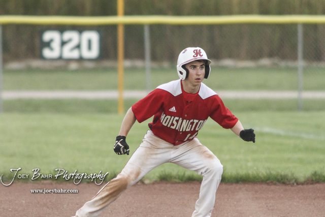 Hoisington Cardinal #14 Alex Schremmer gets a lead from the bag and watches the pitch in the top of the third inning. The Pratt Greenbacks defeated the Hoisington Cardinals 12 to 0 at Bicentennial Park in Hoisington, Kansas on May 9, 2017. (Photo: Joey Bahr, www.joeybahr.com)undefined