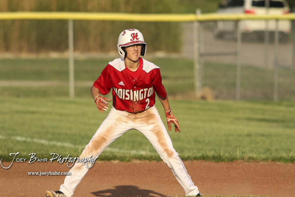 Hoisington Cardinal #2 Derek Boxberger watches for an opportunity to steal second in the bottom of the fourth inning. The Pratt Greenbacks defeated the Hoisington Cardinals 12 to 0 at Bicentennial Park in Hoisington, Kansas on May 9, 2017. (Photo: Joey Bahr, www.joeybahr.com)undefined