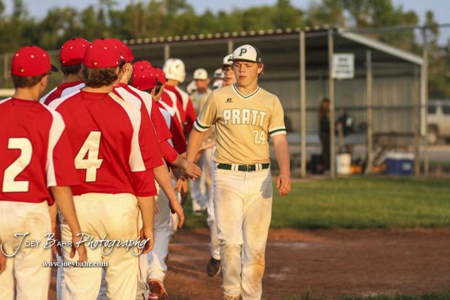 Members of the Hoisington Cardinals and Pratt Greenbacks shake hands following the end of the game. The Pratt Greenbacks defeated the Hoisington Cardinals 12 to 0 at Bicentennial Park in Hoisington, Kansas on May 9, 2017. (Photo: Joey Bahr, www.joeybahr.com)undefined