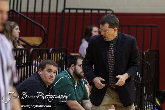 Pratt Greenback Head Coach David Swank reacts to a play during the Pratt Greenbacks at Hoisington Cardinals Boys Basketball game with Pratt winning 66 to 34 at Hoisington Activity Center in Hoisington, Kansas on January 6, 2015. (Photo: Joey Bahr, www.joeybahr.com)