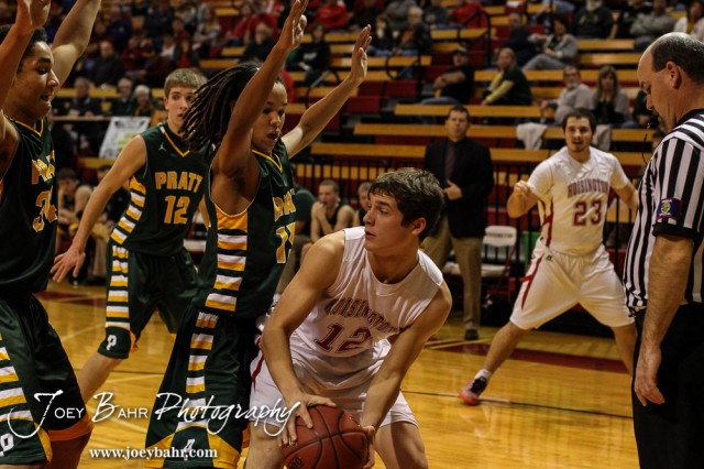 Hoisington Cardinal Steffan Dolechek (#12) looks for a teammate to pass the ball to during the Pratt Greenbacks at Hoisington Cardinals Boys Basketball game with Pratt winning 66 to 34 at Hoisington Activity Center in Hoisington, Kansas on January 6, 2015. (Photo: Joey Bahr, www.joeybahr.com)